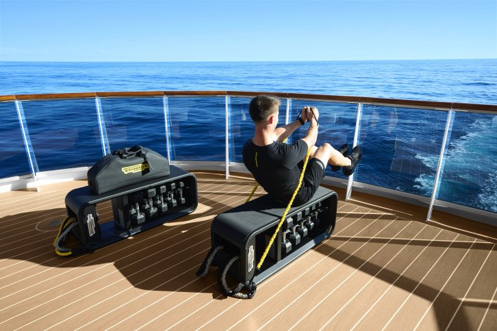Fitness deck overlooking the ocean - equipped with flexible solutions, such as Technogym Skillrow, Group Cycle and Technogym Case Kit, offering variety in an outdoor location.