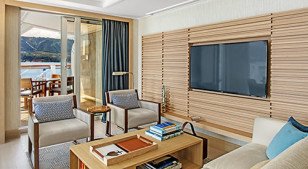 We will also pull back the curtains of our destinations with cinema in our two movie theaters, which show first-run films you have not yet seen as well as destination-driven cinema such as "Room with A View," "Roman Holiday," or "Skyfall." And because the intellect also needs to be stimulated, our theaters will always be buzzing with fresh, new insights from our port talks and onboard lectures that feature the history, art, and culture of our destinations. And since we have always promised you will explore the world in comfort, we have banished uncomfortable theater seating in favor of soft and spacious sofa seating