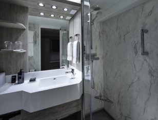 Single Inside Staterooms are perfectly proportioned for the individual traveler. Spacious. Stylish. Singular. These rooms offer all the same amenities and services as a double stateroom, including our exclusive eXhale® bedding, featuring the Cashmere™ Mattress; premium, custom-blended bathroom products; 100% cotton plush bathrobe and towels, and more.