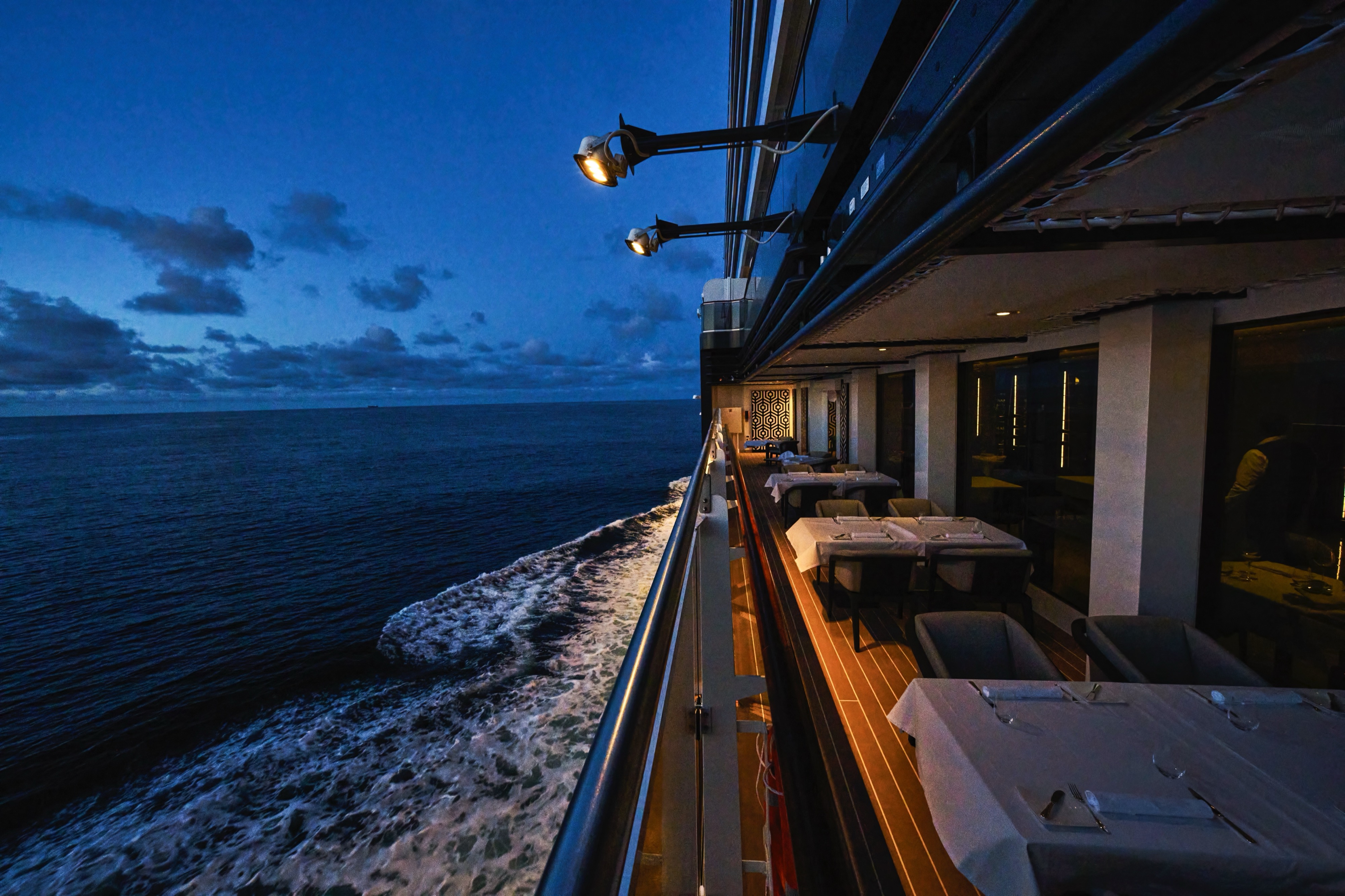 Stand in awe of the panoramic ocean views from your expansive private terrace – extending over the full ship's aft width – with a spacious infinity whirlpool and elegant outdoor dining and lounging areas exquisitely designed by Manutti.