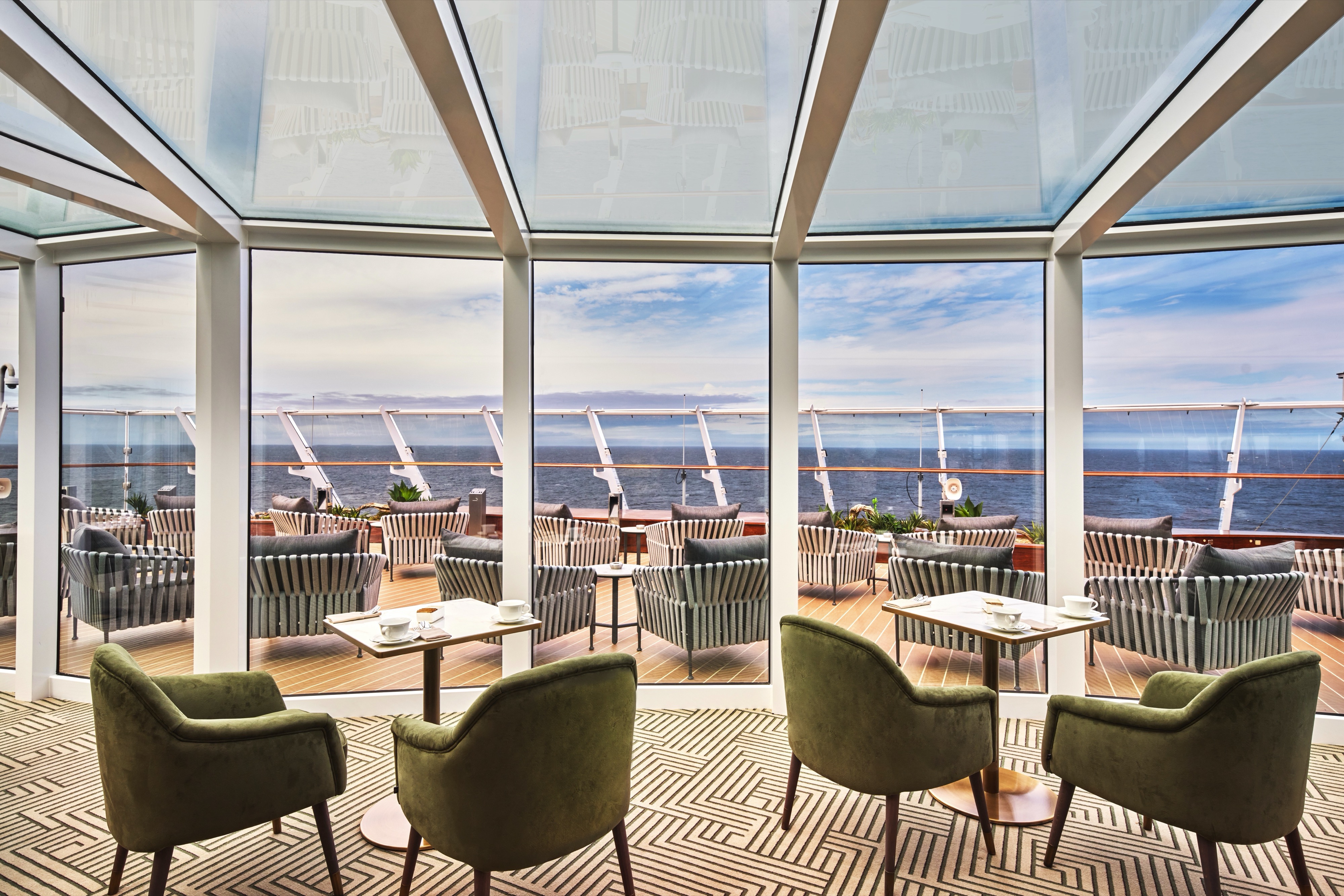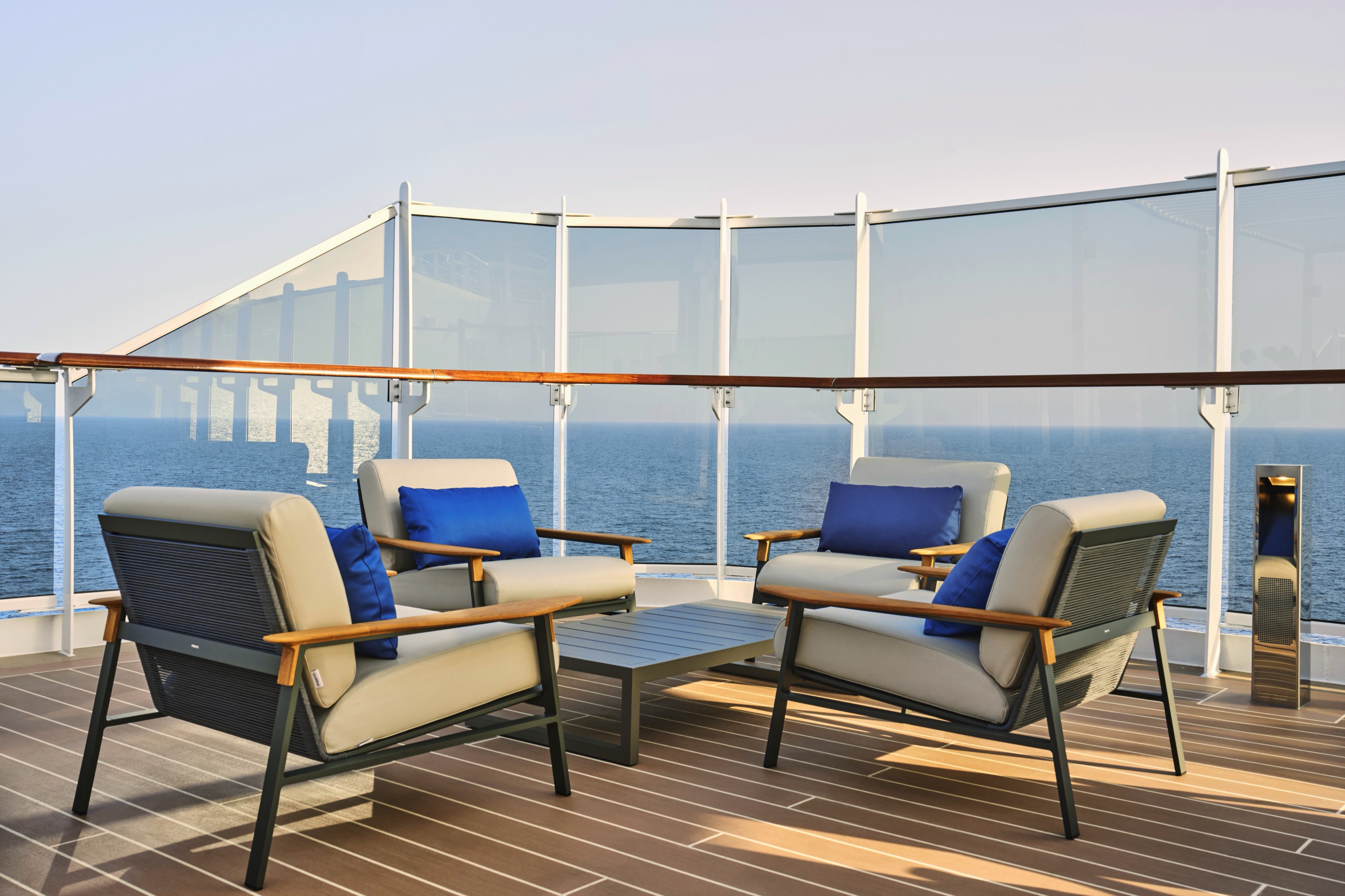 Our Ocean Grand Terrace Suites are situated on decks 6 and 7, offering a more spacious private sun terrace featuring a dining table and a daybed, allowing guests to savour the ocean from the comfort of their daybed.