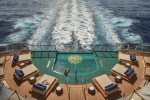 Panoramic ocean-front terrace covering the full ship’s width, with a private spacious whirlpool, day beds, a dining table, a scenic lounge area, shower