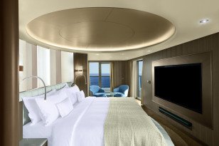 Abundant in space and light, the elegant Serenity Residences feature oversized floor-to-ceiling windows leading onto the expansive panoramic terrace on the ship's aft, including magnificent ocean views, a private outdoor whirlpool, a dining table, relaxing sun beds and a comfortable outdoor lounge designed by Molteni & C.