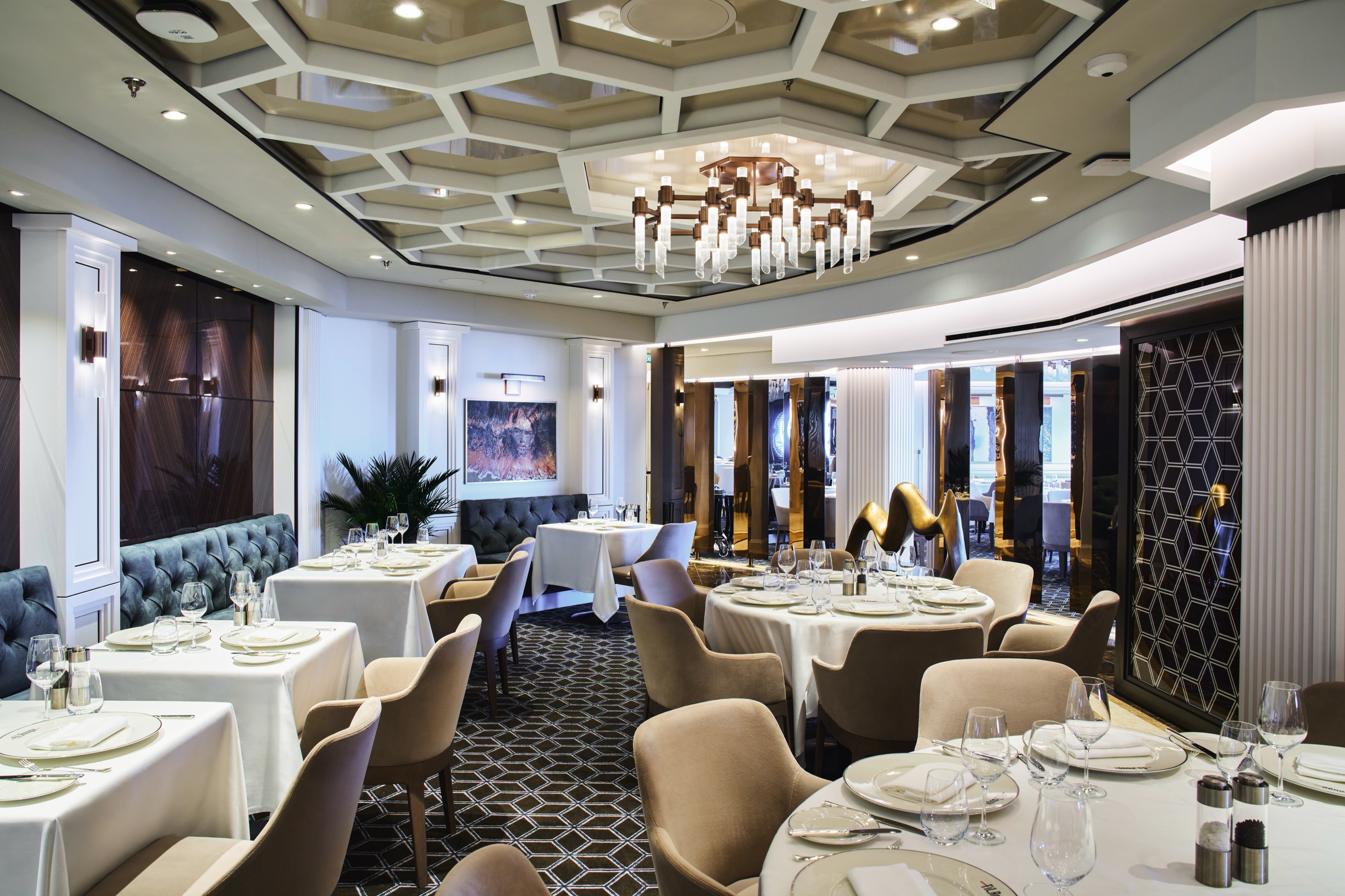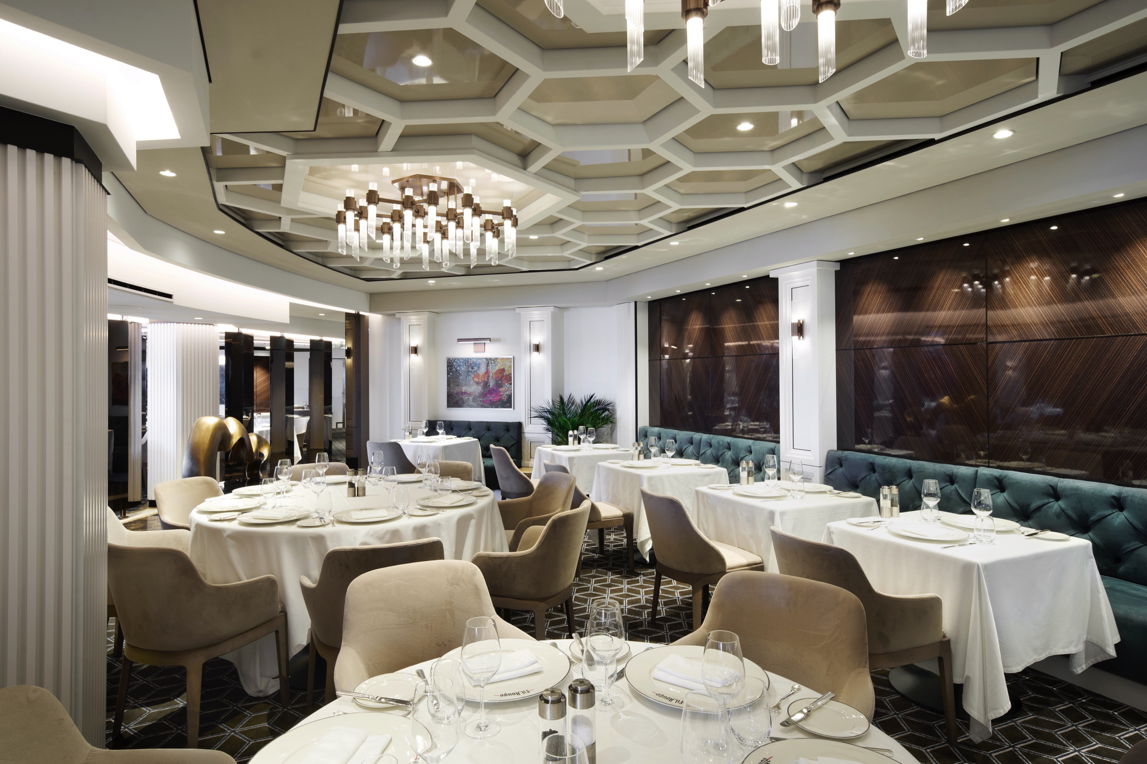 A universal, timeless dining experience, Fil Rouge is a visual articulation of the fundamentals of elegance. Intricate hexagons representing the simplest expression of perfection contrast with clean white walls adorned with inspiring works of art.