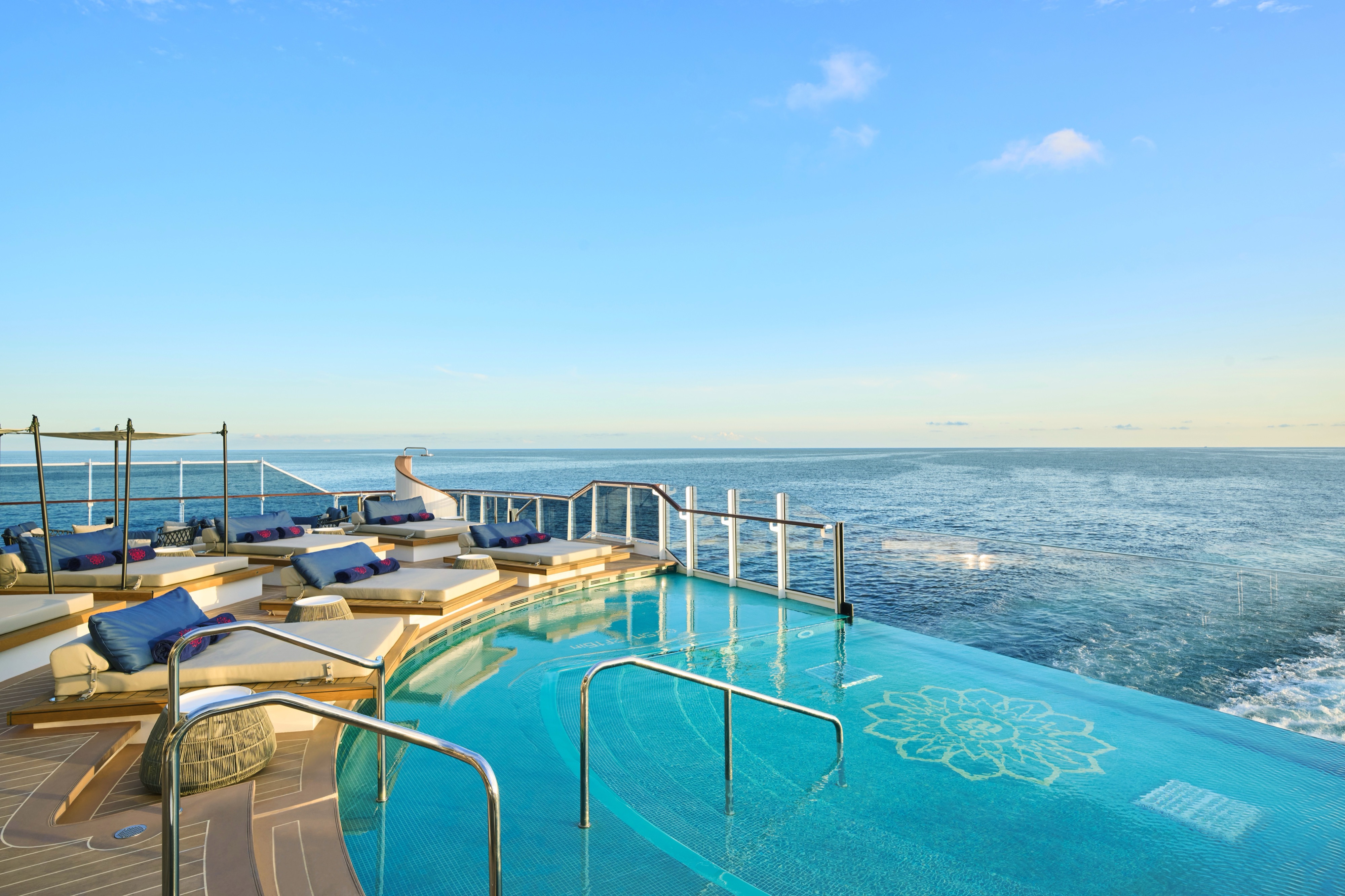 Abundant in space and light, the elegant Serenity Residences feature oversized floor-to-ceiling windows leading onto the expansive panoramic terrace on the ship's aft, including magnificent ocean views, a private outdoor whirlpool, a dining table, relaxing sun beds and a comfortable outdoor lounge designed by Molteni & C.