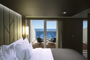 Each of our Penthouses offers a spacious living area and a separate dining area for four, allowing guests to entertain others or retreat in style as they see fit. Floor-to ceiling doors lead onto an expansive private sun terrace with a dining table and a daybed for ultimate relaxation at sea.