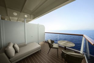 Our Ocean Terrace Suites are amongst the largest entry-level suites in the industry. Each one has floor-to-ceiling windows, and a private sun terrace featuring a dining table and a daybed, allowing guests to feel closer to the ocean as it carries them on their journey.